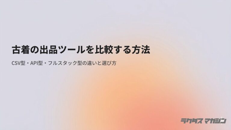古着の出品ツールは数が多く、機能もさまざまです。個別のツール名で比較しようとしても、仕組みそのものが異なるため判断基準が定まりません。出品ツールを「CSV型」「API型」「フルスタック型」の3カテゴリに分けて比較すれば、自社の出品点数・チャネル数・運用体制に合ったカテゴリが先に決まり、その中から候補を絞り込めます。この記事では、3つのカテゴリの違いと選び方、導入前に確認すべきポイントを解説します。